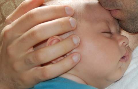Brunch was fun and uneventful and we headed back home in a sprinkling rain (but I was covered up, of course). I ate a snack and before long, Uncle Mac came by to visit. He held me like a pro! I look even smaller than I am compared to him. After he left, Dad got a pretty bad headache (again!). He wanted to give Mom a break from taking care of me, so he took me into the bed with him and curled up next to me. I was wide awake, butI knew that Mom and Dad could really use some peace and quiet, so I just hung out in the dark and made little noises. After about half an hour, Mom fed me and we hopped in bed for the night, around 9:00.