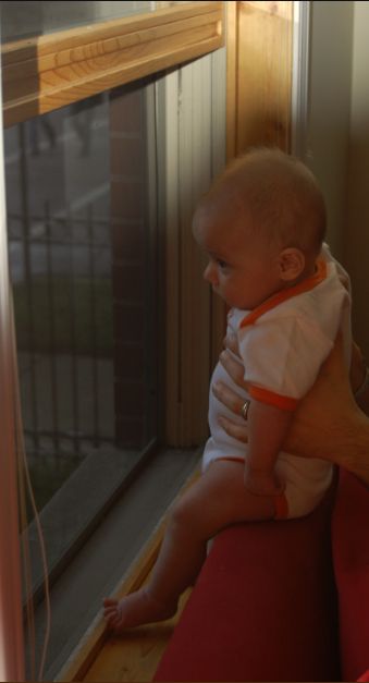 Dad left for a couple hours to go to a meeting and I hung out with Mom and Grandpa. During the afternoon, Dad took a break from work to let me sit on the back of the couch and look out the window, but while doing that, he accidentally bumped my head against the window. It hurt so much and just got me in a bad mood. Of course, he eventually just handed me off to Mom and got back to work.