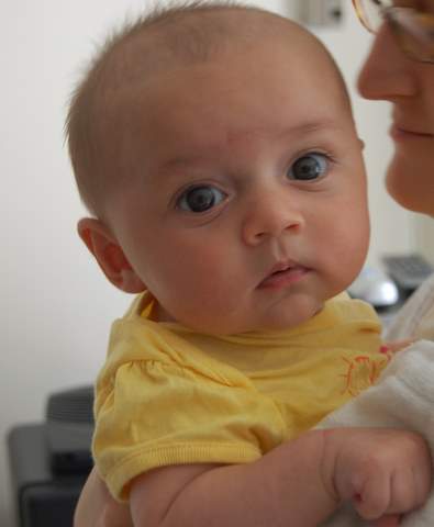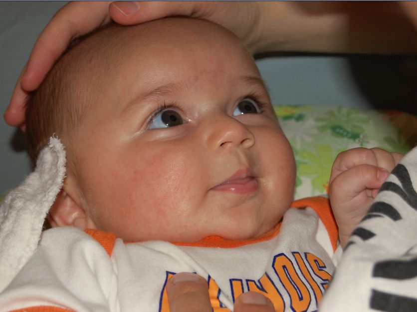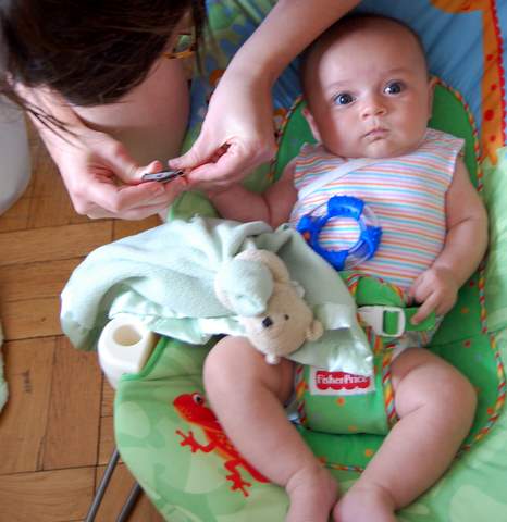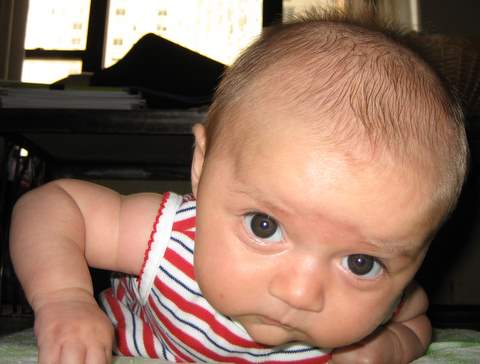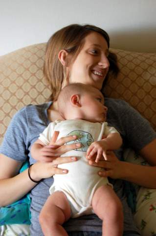 One of the highlights of the day was having our first Chicago visitor (whom I can remember, anyway): Nick! Nick drove all the way from Milwaukee just to meet me! That was really nice of him. I was so excited to meet him that as soon as Mom handed me to him, I spit up — and quite a voluminous one, if I may say so — all over his button-down shirt. The button-down shirt must be a pretty big deal, because Mom had been talking about for several minutes — how she never sees Nick so dressed up and how nice he looked. well, I can’t think of a better way to accessorize than spit up!