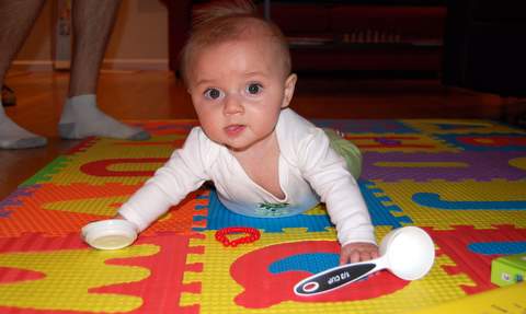 Friday was especially fun because Dad was working from home, so every time he came upstairs for a snack or a drink of water I got to see him a little bit (he may have even made a few extra trips just to see me!). Dad had ordered a bunch of things for me online that arrived today. One of the things, though, he had to pick up from the store was foam play mat. (Mom & Dad discovered this from my soon-to-be-friend Jackson who has one!) Ever since I started sitting up, I’ve realized that on each floor there’s a pile of blankets that I usually hang out on. Now, finally, I feel like I have a permanent play area on this foam mat (2/3 of which is in the family room; 1/3 of which is in Mom’s and Dad’s bedroom). I’m slowly taking over the house!