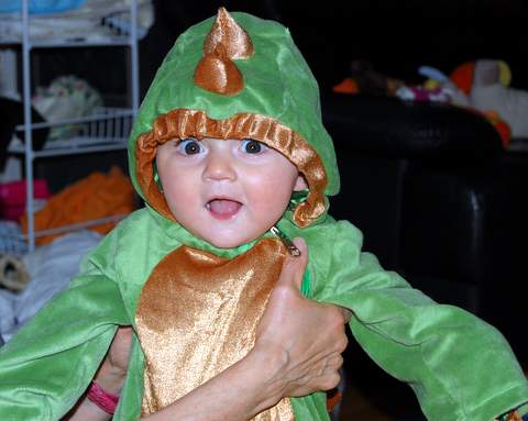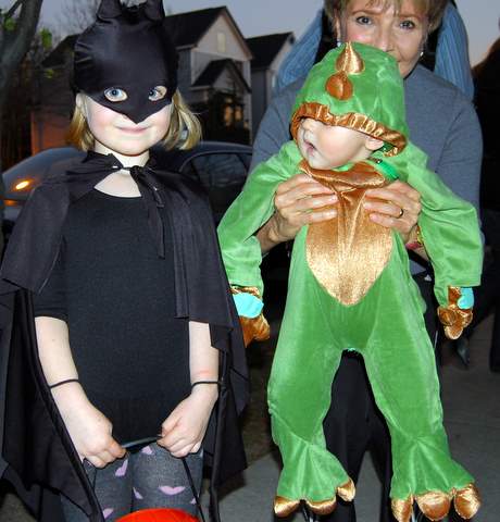 Then, around 5:30, Nana decided to change me out of my totally clean and dry outfit and into a green…dragon? Nana couldn’t even contain her laughter! Nana, Dad, and I (and later, Grandpa and Mom) went outside and hung out by our front gate. Then, out of nowhere, kids came — dressed up in all kinds of crazy costumes — to meet me. Dad kindly handed out candy to all of my new friends. I even got my picture taken with a group of cute kids and a scary looking batman (not “batgirl,” she insisted).