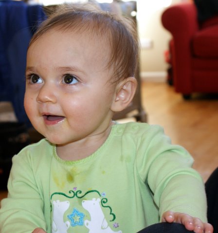 Dominick’s was especially fun because Dad let me sample the jack cheese with little pieces of pepper in it. I really liked the spicy flavor. We made it through pretty quickly and I giggled a lot when Dad made faces at me. We got back home and I ate lunch (actually, I rejected most of it — parsnips are boring and the chicken was too dry!). Then we had an interior designer come by to tell us how we could make our home a little prettier. I decided to be really, really fussy. So fussy that Dad had to leave the meeting to take care of me and could only settle me down by getting some finger foods out of the fridge. I finished the green beans and ate some cheese and apples.