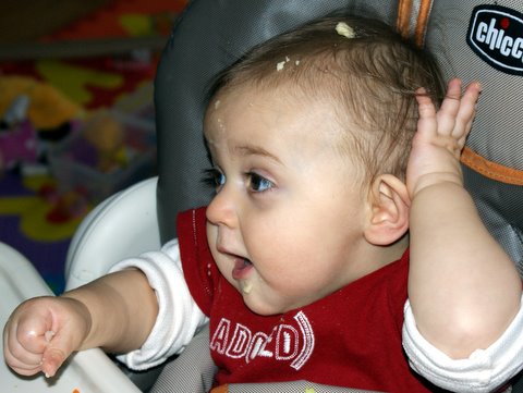 For lunch I got to try a new dish: edamame & yogurt.  It was pretty good and went down easy.  I also got to try a new finger food: cheese.  Despite what the picture suggests, some it actually ended up in my mouth.