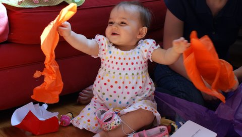 I got up at my normal time and Aunt Claire joined Dad and I on our weekly trip to the grocery store. We had a great time, as usual. Everything seemed pretty normal until we went to the floral section and bought a bunch of balloons, including an Elmo balloon that said “Happy Birthday.” We got home and I was so happy to see that Grandpa Droste had come for the weekend! The entire Droste side of my family was visiting us — yet another hint that something was up.I played with my aunts and grandparents while Mom and Dad were cooking in the kitchen. I took my nap a bit later than usual and got up right around 11:30. I came downstairs and saw that the house was really clean and lots of yummy food had been cooked. At about 12:00 Mom took me up to my room and changed me into a brand new dress (while Dad conducted an impromptu photo shoot).