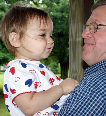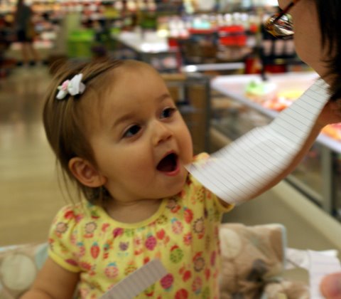 Dad stopped working about half an hour early and we took a family trip to the grocery store! It was so fun to have Mom there with us and to show her all of the fun games we play (counting the cows on the milk cartons, ripping up the list when it’s all done, and of course, playing with the “organic” stickers in produce!). We stopped by Oberweis on the way home to get some dessert for Mom & Dad (but not me!).