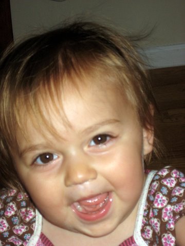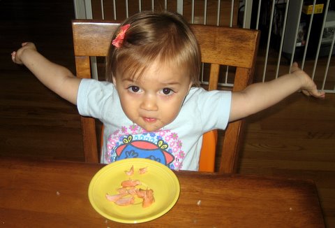 We got home and played together until nap time. I had a pre-nap snack (a banana, as usual) and then walked up the stairs and went to sleep. When I got up, I helped Dad cook, and in the process ate some raw onion (eww!) and some raw red pepper (yummy!).